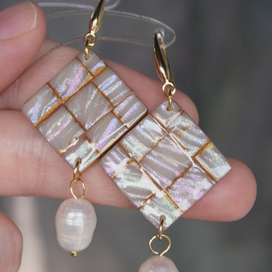 Gold plated, unique and light wear polymer clay earrings. Real freshwater pearls hanging!