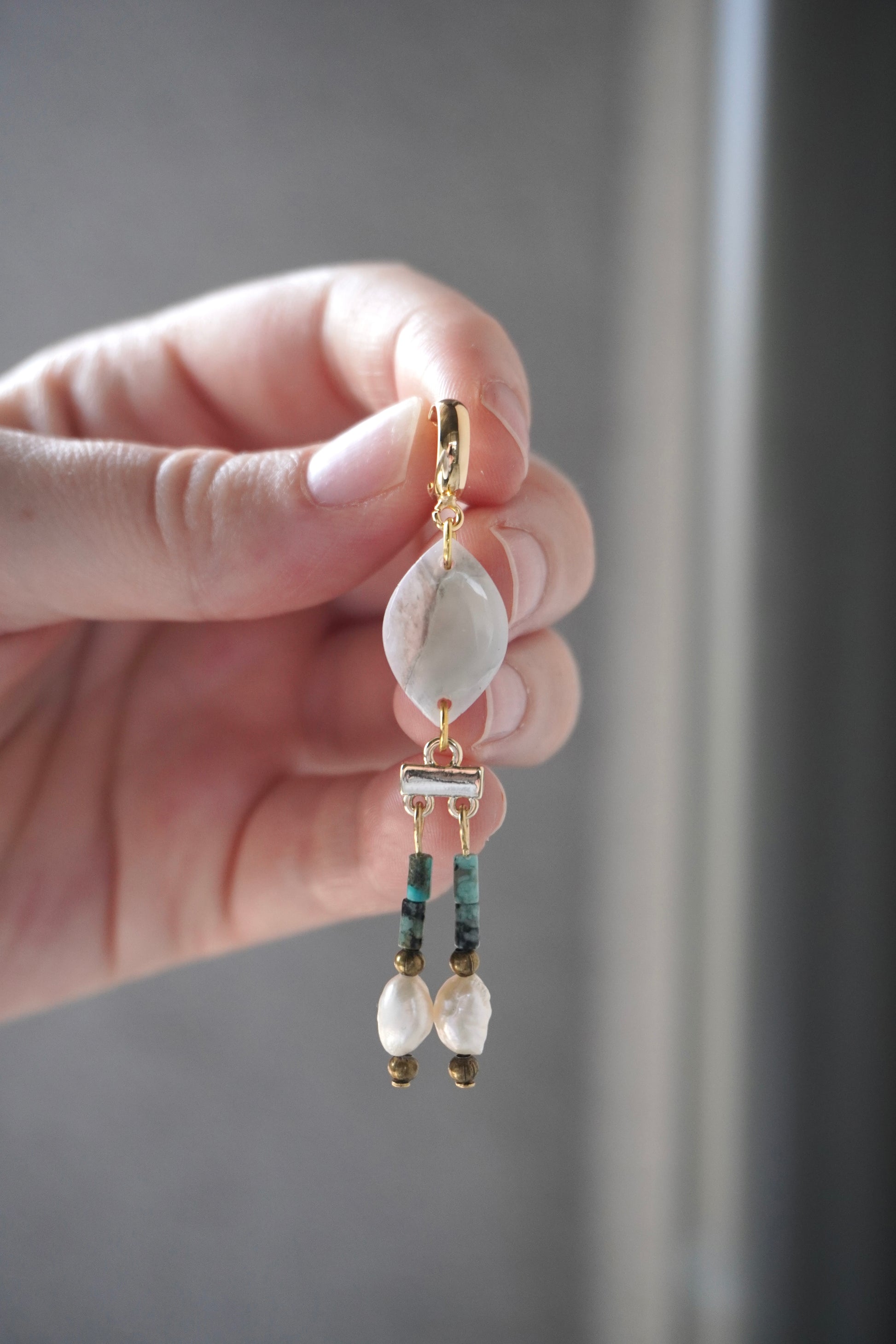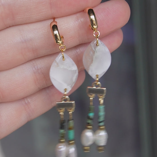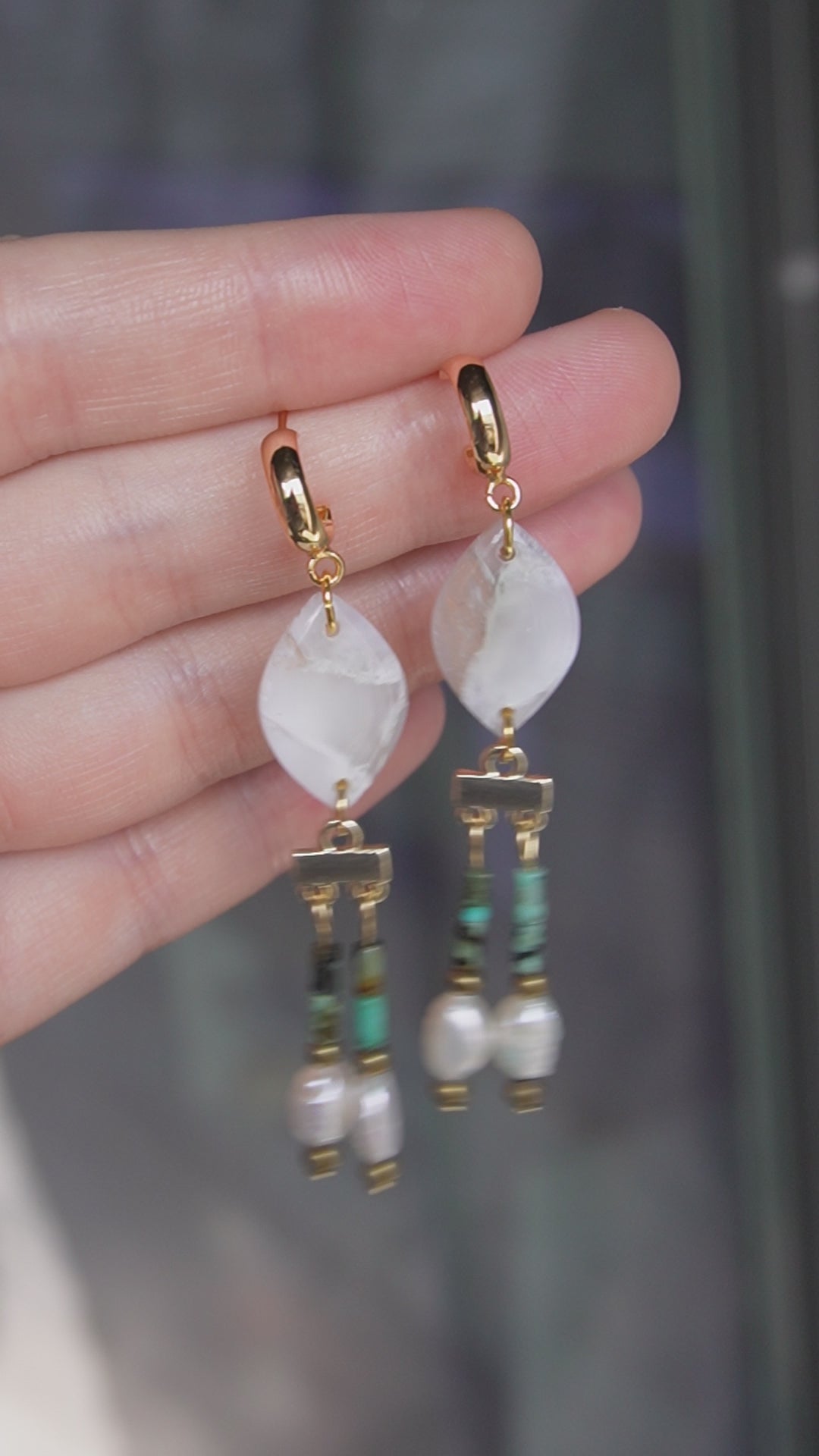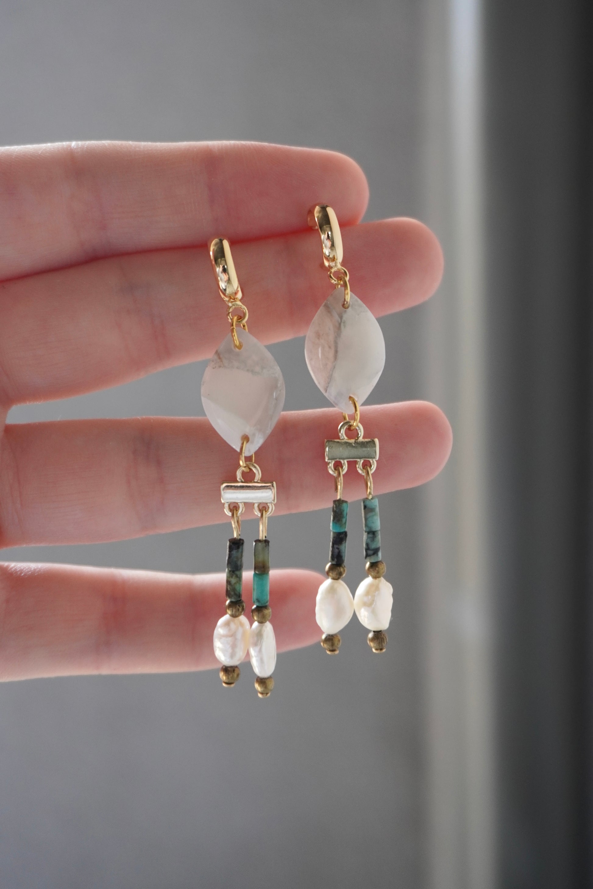 Gold plated, unique and light wear polymer clay earrings. Real freshwater pearls hanging!